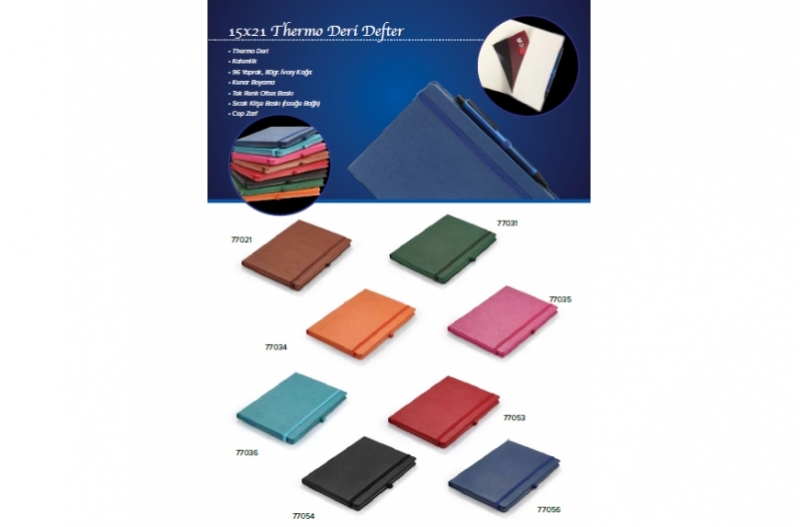 Thermo Deri , Kalemlik , 96 Yaprak , 80gr. İvory Kağıt , Kenar Boyama , Tek Renk Ofset Baskı, Sıcak Klişe Baskı (isteğe bağlı) , Cep Zarf