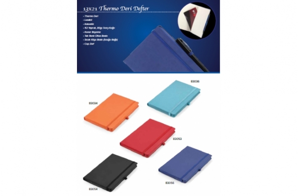 Thermo Deri , Lastikli , Kalemlik , 112 Yaprak , 80gr. İvory Kağıt , Kenar Boyama , Tek Renk Ofset Baskı, Sıcak Klişe Baskı (isteğe bağlı) , Cep Zarf